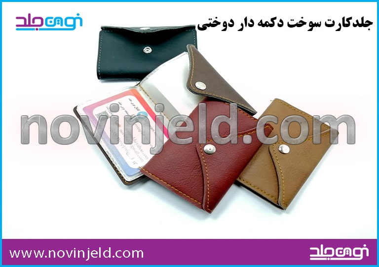 جلد کارت سوخت دکمه دار: این کیف پرفروش و با چرم دولا ساخته شده. ۱۰کارته هست. در رنگ های متنوع تولید میشود چاپ داغی این محصول جذاب است.